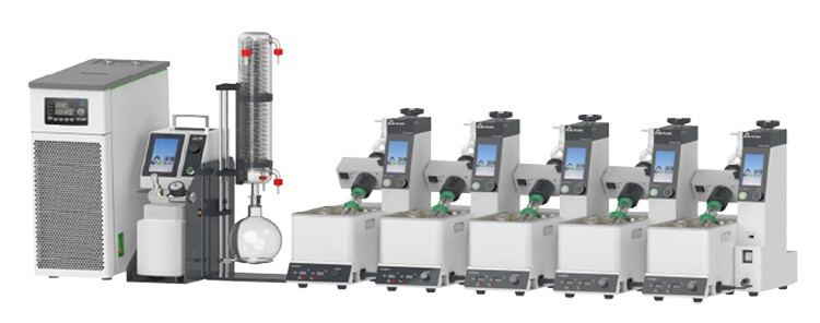 陣列旋轉蒸發(fā)儀 陣列旋轉蒸發(fā)儀可以搭載六個 mini 旋轉蒸發(fā)儀單元,既可以滿足同時使用,也支持獨立操作,可以獨立 的進行溫度設置、轉速調整、釋放真空等操作,不干擾其他旋轉蒸發(fā)儀單元的正常工作。
